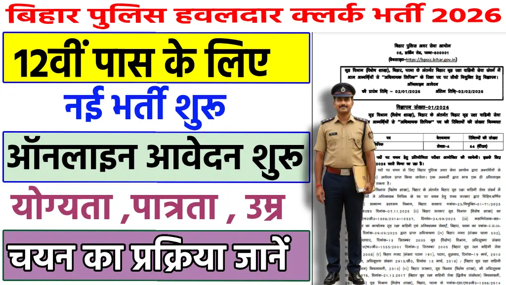Bihar Police Havildar Clerk Vacancy 2026 को लेकर युवाओं के लिए एक बड़ी खुशखबरी सामने आई है। बिहार पुलिस अधीनस्थ सेवा आयोग (BPSSC) ने Havildar Clerk Vacancy 2026 के तहत कुल 64 पदों पर भर्ती के लिए आधिकारिक नोटिफिकेशन जारी कर दिया है। जो उम्मीदवार बिहार पुलिस में सरकारी नौकरी पाने का सपना देख रहे हैं, उनके लिए यह एक शानदार अवसर है।